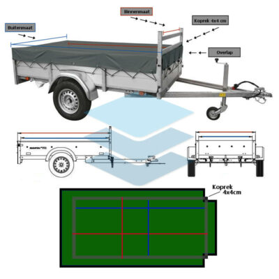 Het is aan te raden om uw PVC afdekzeil ruimer/groter te bestellen dan de afmetingen van de bakmaat van uw aanhanger/laadbak om uw lading inclusief de zijborden uitstekend af te dekken. Zo kunt u ook bij een hogere lading de boel nog prima afdekken. De 2 uitsparingen zijn ideaal voor aanhangers met een koprek of een ongelijke rand aan de achterzijde. Stel: U wilt de zijborden van uw aanhanger/laadbak 20cm afdekken. U kiest hieronder dan voor 2 uitsparingen van 20x20cm. Heeft u een koprek met staanders van 4x4cm, dan moet u hier ook rekening mee houden. U neemt dan de maat tussen de staanders en gaat hier mee aan de slag.
