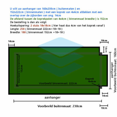Stel. U wilt uw zijborden 14cm afdekken. Dan heeft u dus hoekuitsparingen van 18x18cm nodig, want de 4cm van de staander gaat hier nog af. Vervolgens telt u dan 36cm ( 2 x 18 ) op bij de binnenmaat van de breedte van uw aanhanger.